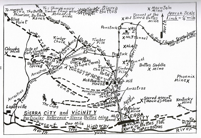 Just upslope to the north and above the town of Sierra City were several mines, the most notable being the Sierra Buttes Mine which, in its 80 years of existence, produced $17 to $20 million in gold. From 1870 to 1905 it was owned by English investors who paid the over 200 miners who worked there $2.50 to $3 a day. By the time the mine closed there were very few standing trees in this area – the vegetation that remained was primarily brush.